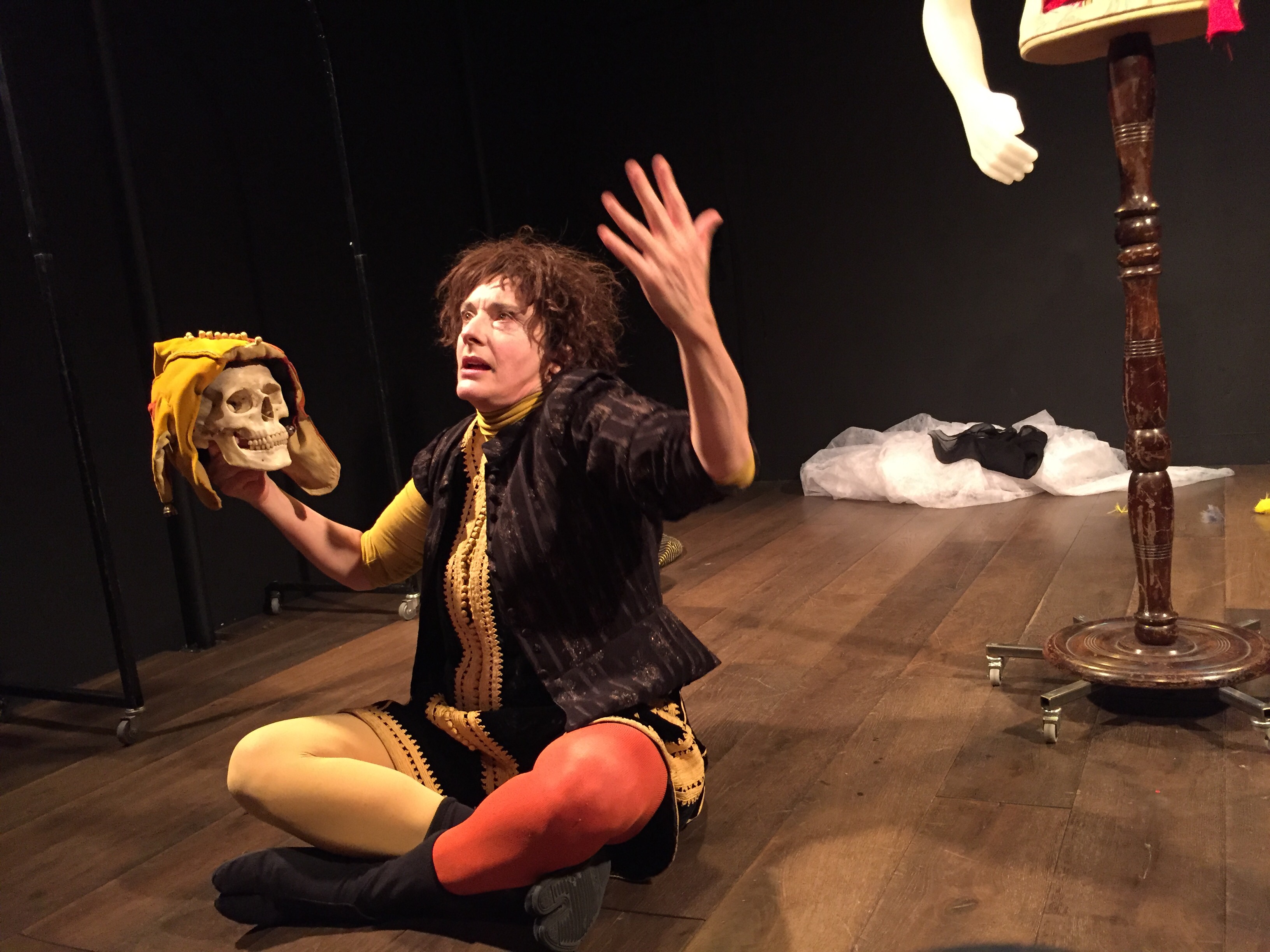 Elle occupe l’espace, se joue bien des quelques accessoires, un mannequin désarticulé, un crâne, une robe blanche qui sera Ophélie et Juliette, une fraise…