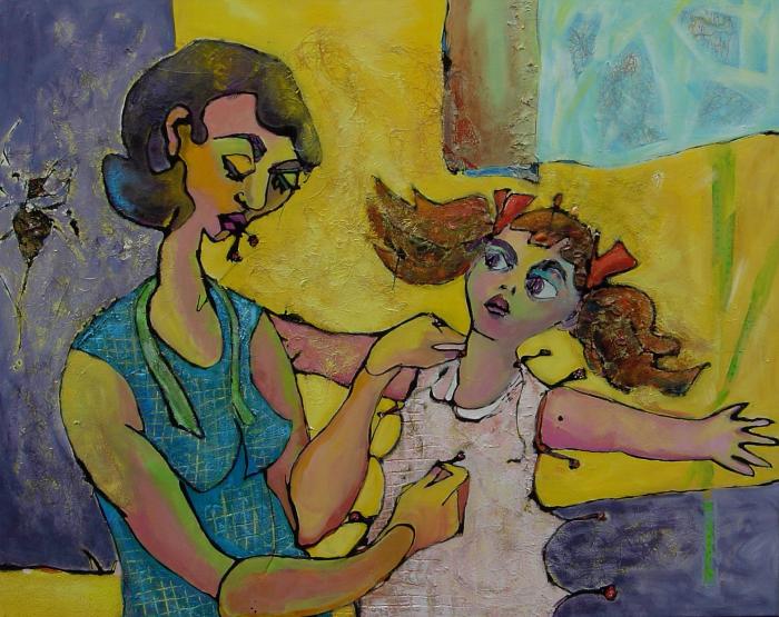 Le ton de la douzaine de tableaux qui va suivre est donné. Liza et moi expose la façon dont fonctionne, dont dysfonctionne, la relation entre les mères et les filles. La mère trop présente qui s’interroge, veut bien faire, protéger, ne comprend pas. La fille se sent enfermée, incomprise. La mère pense que sa fille a encore besoin d’elle, la mère veut tisser un lien, la fille y voit un filet, plus tard la fille sera mère.