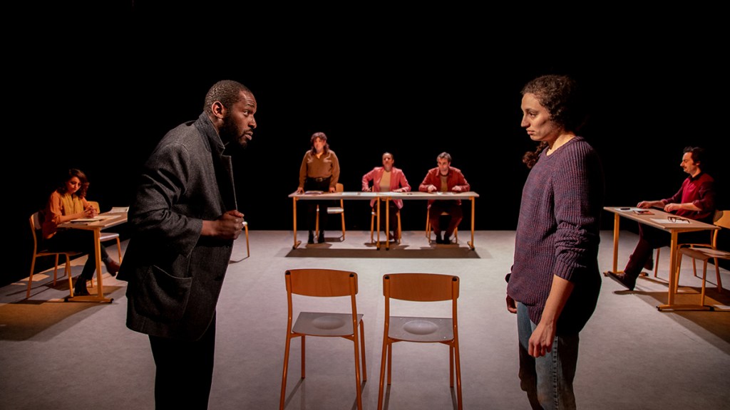 Sur la scène, des tables de lycée, des chaises, jaune, beige, organisées en carré. Ah, salut Mylène. Salut Alain. J’voulais te dire que je vais laisser mon téléphone allumé. Mylène est CPE, Alain prof de SVT. Avant que le conseil de discipline commence, le quotidien est là, quel prénom pour ce bébé, Gaston, Marcel… et pourquoi pas Félix, comme le prof de philo.