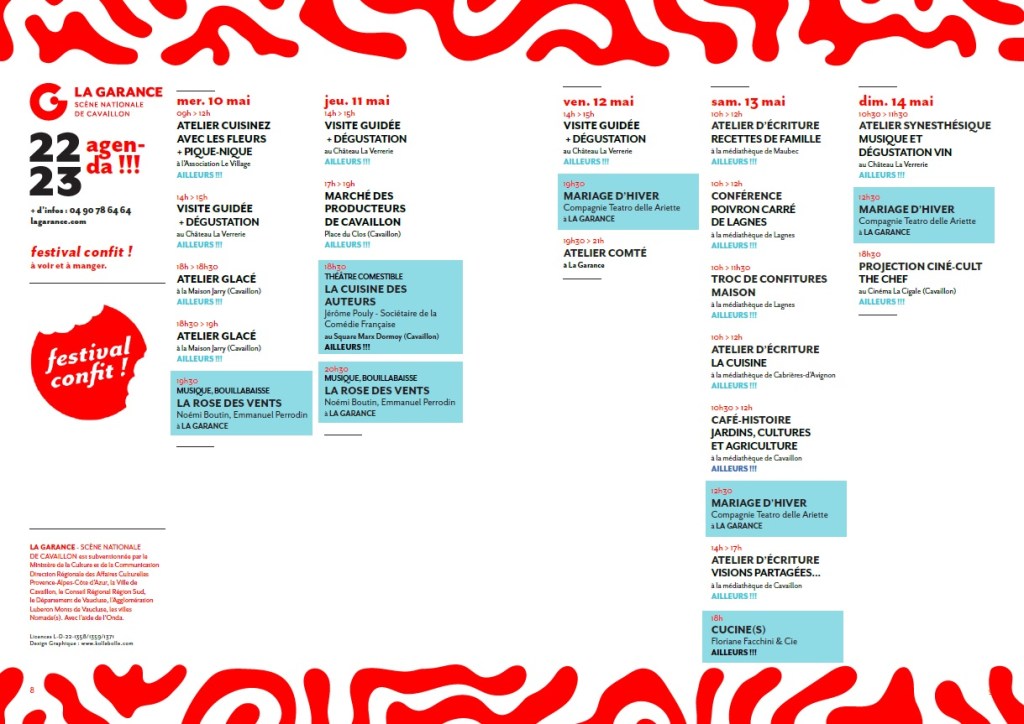 Du 10 au 14 mai 2023, La Garance SN de Cavaillon organise le festival Confit ! des spectacles, des dégustations, des conférences, des balades, des ateliers, des visites, des fêtes. De quoi réjouir ceux qui ont compris Baudelaire : Enivrez-vous !