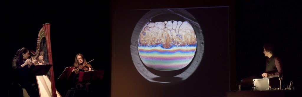 Soap Opera à La Reine Blanche : mi conférence de Florence Elias, mi concert du trio Artemisia, l’occasion d’apprendre quelques principes qui font les bulles de savon, de voir apparaitre de belles images aussi poétiques qu’oniriques.